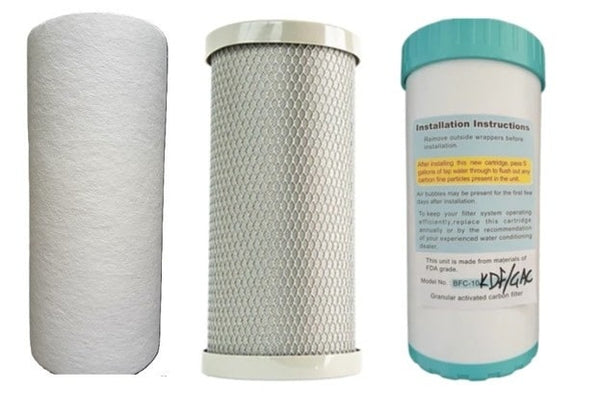 Triple set of replacement filters for most Jumbo Big Blue and Big White 10" triple Housings. For homes on mains/town water supply with chlorinated chemical treated water, for the reduction of chemicals and heavy metals - Absolutely no compromise on quality.